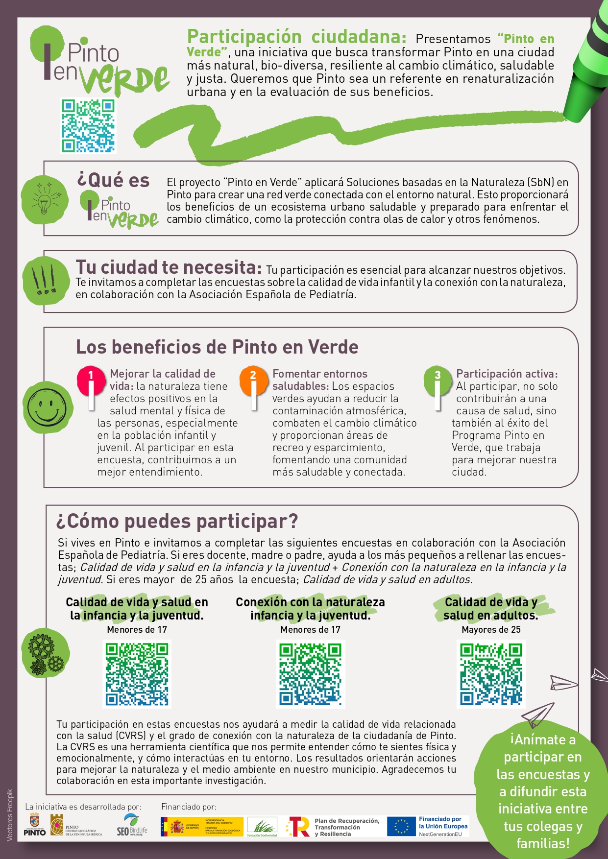 Queremos que Pinto sea un referente en renaturalización urbana y en la evaluación de sus beneficios. Para conseguirlo, tu participación en estas encuestas será fundamental pues nos ayudará a medir la calidad de vida relacionada con la salud (CVRS) y el grado de conexión con la naturaleza de la ciudadanía de Pinto. La CVRS es una herramienta científica que nos permite entender cómo te sientes física y emocionalmente, y cómo interactúas en tu entorno. Agradecemos tu colaboración en esta importante investigación.